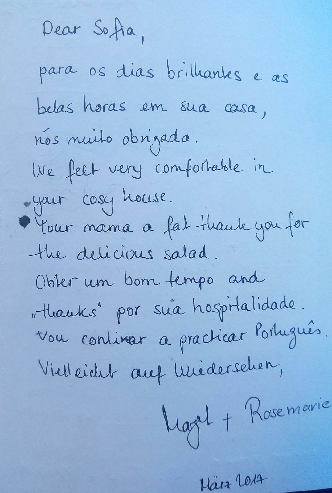 "We felt very comfortable in your cosy house;" "A fat thank you for your mama for the delicious salad".